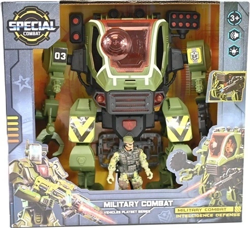 Robot militarny z dźwiękiem to imponująca zabawka dla małych miłośników futurystycznych bitew i technologii. W zestawie znajduje się duży robot bojowy oraz figurka żołnierza, który może zasiąść w kabinie maszyny. Pojazd wydaje realistyczne dźwięki walki i maszyn, co sprawia, że zabawa staje się jeszcze bardziej wciągająca.
