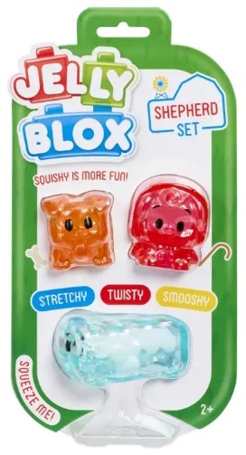 Jelly Blox - Shepherd Set to niezwykle urocza kolekcja trzech miękkich, rozciągliwych figurek o galaretkowej strukturze. Zestaw został stworzony z myślą o najmłodszych – kolorowe, transparentne bloczki w kształcie sympatycznych zwierzątek zachęcają do zabawy, ściskania, ugniatania i skręcania.