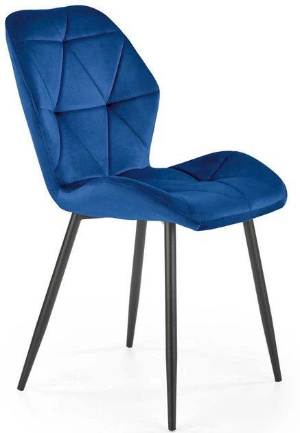 Krzesło K453 to połączenie nowoczesnego stylu i elegancji. Jego granatowy kolor tapicerki z welwetu oraz pikowane siedzisko i oparcie w geometryczne wzory sprawiają, że doskonale wpasowuje się w najnowsze trendy wnętrzarskie. Ergonomiczny kształt z lekko zaokrąglonymi krawędziami zapewnia komfort, a smukłe, czarne nogi nadają mu nowoczesny charakter.