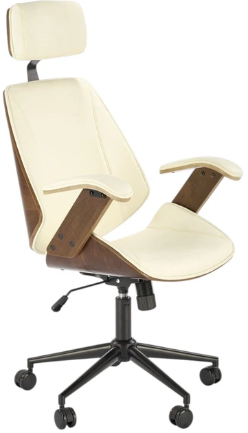 Wyjątkowy fotel biurowy o eleganckim, reprezentacyjnym wyglądzie, który doskonale sprawdzi się w gabinecie lub biurze o podwyższonym standardzie. Ergonomicznie wyprofilowane oparcie zapewnia odpowiednie wsparcie dla pleców, zwiększając komfort codziennej pracy. Miękkie, wygodne siedzisko sprzyja wielogodzinnemu użytkowaniu bez uczucia zmęczenia. Model wyposażony jest w mechanizm regulacji wysokości, umożliwiający idealne dopasowanie do stanowiska pracy. Obrotowa konstrukcja oraz stabilna podstawa gwarantują funkcjonalność i bezpieczeństwo użytkowania. Połączenie odcieni orzecha i kremu nadaje całości elegancji i podkreśla prestiżowy charakter wnętrza.