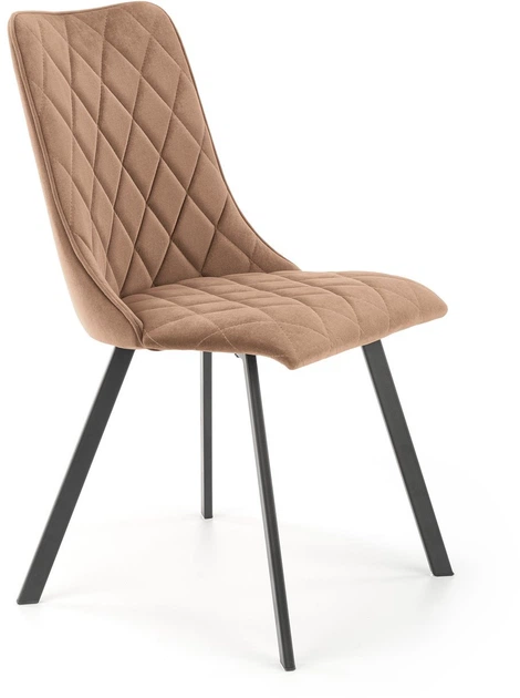 Beżowe, tapicerowane krzesło K450 wykonane zostało z wykorzystaniem miłej w dotyku i delikatnie cieniującej tkaniny velvetowej Bluvel 28. Mebel wyposażony został w czarne, proste, malowane proszkowo, metalowe stópki dające solidne podparcie przeszywanemu od wewnątrz siedzisku oraz oparciu. Elegancka forma zestawu pozwala na jego wyeksponowanie niemal w każdym stylu wyposażeniowym wnętrz. Niewielkie wymiary krzesła sprawiają, że odnajdzie się z powodzeniem nawet w niewielkich pomieszczeniach. Mebel dostarczany jest w wersji wymagającej niewielkiego montażu.