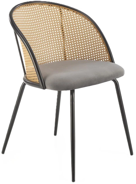 Siedzisko krzesła K508 zostało obite miękką, przyjemną w dotyku tkaniną, która zapewnia wysoki komfort siedzenia i podkreśla ekskluzywny charakter mebla. Popielaty to jeden z najmodniejszych kolorów wnętrzarskich, idealnie pasujący do aranżacji glamour, boho, nowoczesnych oraz urban jungle. Oparcie z rattanu nadaje krzesłu lekkości wizualnej i oryginalnego stylu.