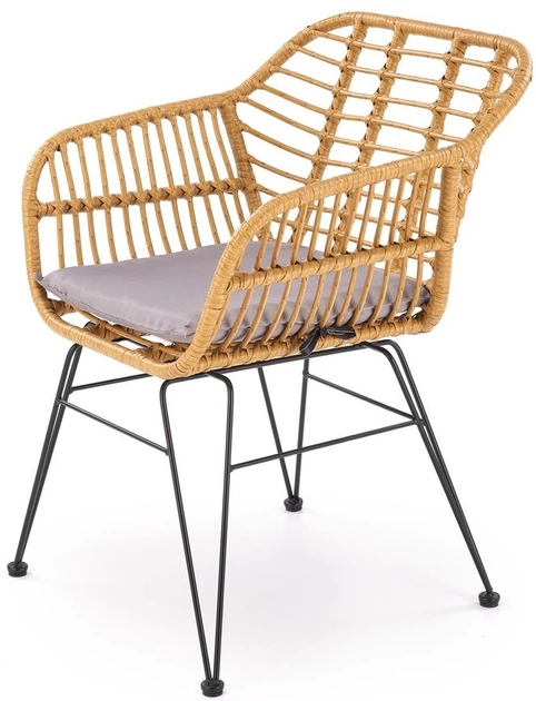 Siedzisko i oparcie krzesła zostały wykonane z wysokiej jakości syntetycznego rattanu, który gwarantuje trwałość oraz odporność na warunki atmosferyczne. Naturalny odcień rattanu nadaje krzesłu organicznego charakteru, który doskonale komponuje się z różnorodnymi stylami wnętrz, od boho po nowoczesny minimalizm. Dodatkowo, miękka poduszka w kolorze popielatym zapewnia komfort użytkowania, idealnie współgrając kolorystycznie z siedziskiem.