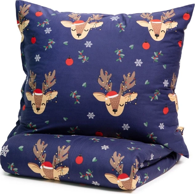 Świąteczny komplet pościeli Rudolph składa się z poszewki na kołdrę o wymiarach 160 × 200 cm oraz dwóch poszewek na poduszki 70 × 80 cm. Wzór przedstawia urocze renifery w czapeczkach i światełkach, które w połączeniu z przyjemną dla oka paletą barw dodają wnętrzu przytulności i ciepła.