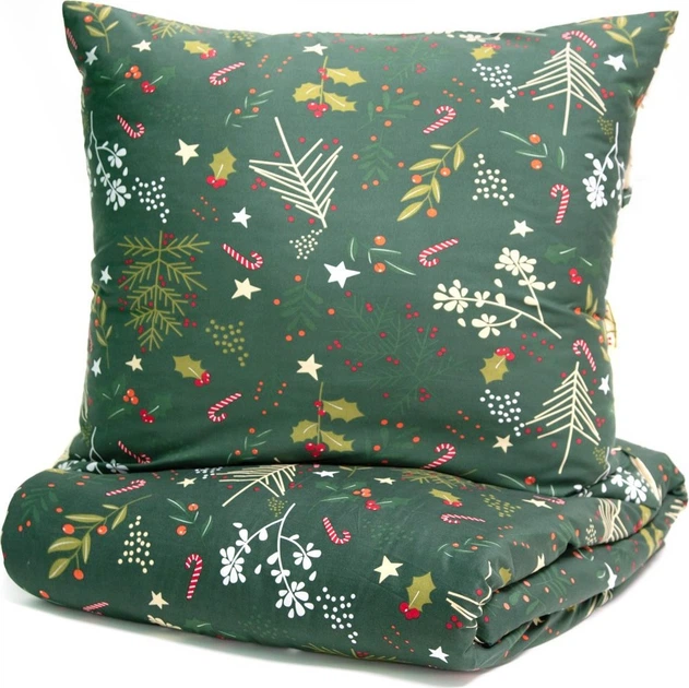Świąteczny komplet pościeli Godis składa się z poszewki na kołdrę o wymiarach 200 × 220 cm oraz dwóch poszewek na poduszki 70 × 80 cm. Uroczy, świąteczny wzór z szyszek, liści ostrokrzewu i jemioły pięknie komponuje się z dwustronnym tłem, umożliwiając zmianę aranżacji wnętrza w zależności od nastroju.