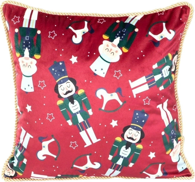Poszewka Aitona to wyjątkowy, świąteczny akcent, który wprowadzi do wnętrza ciepło i radosny nastrój. Została zaprojektowana w pięknym, czerwonym kolorze, z ozdobnym motywem dziadków do orzechów, koników na biegunach i gwiazdek. Poszewka jest dwustronna — jedna strona gładka, druga zdobiona wzorem. Całość wykończono beżową lamówką w formie spiralnie skręconego sznureczka, który dodaje elegancji i wyjątkowego charakteru.