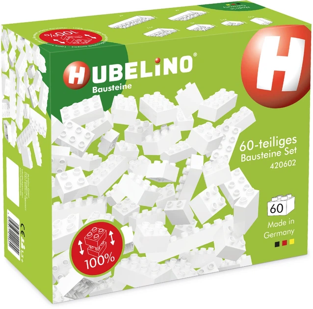 Klocki Hubelino białe, 60 elementów klocki są produkowane w Niemczech i są kompatybilne z innymi popularnymi systemami klocków innych producentów.