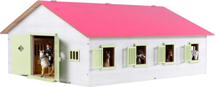 Ta stajnia dla koni Kids Globe jest wykonana z drewna i zbudowana w skali 1:24. Ma różowy dach i oferuje miejsce dla siedmiu koni w boksach. Wymagany jest montaż, a konie nie są dołączone. Stajnia jest w skali 1:24 i jest kompatybilna z końmi Schleich.
