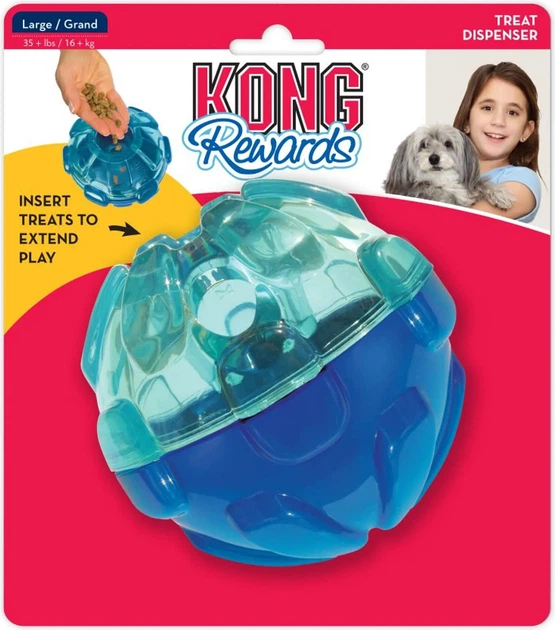 Kong Rewards Ball to duża piłka z dozownikiem smakołyków w kształcie piłki wykonanej z wytrzymałego materiału. Ten dozownik smakołyków jest wykonany z bardzo wytrzymałego materiału, który doskonale nadaje się do wielogodzinnej zabawy bez hałasu. Ze względu na kształt piłki, zabawka odbija się i toczy w nieprzewidywalnych kierunkach, gdy jest toczona lub rzucana. Stanowi to dla psa wyzwanie psychiczne i stymuluje instynkt łowiecki. Przez otwory w piłce, zabawka uwalnia nagrody, przekąski lub jedzenie podczas toczenia, nagradzając psa za jego pomysłowość i zabawę. Zabawki można również używać z normalną karmą, aby pomóc w kontroli wagi.