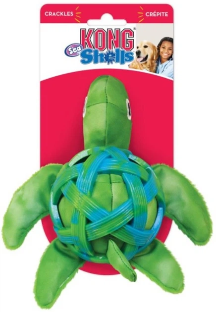 Kong Sea Shells Turtle to pluszowy żółw z pancerzem w kształcie pustej piłki dla psów. Zabawka ta posiada szeleszczące elementy, dzięki czemu idealnie nadaje się do aportowania, potrząsania i żucia. Zewnętrzna warstwa żółwia to elastyczna, sprężysta piłka, która po ściśnięciu powraca do pierwotnego kształtu. Pusta konstrukcja piłki ułatwia chwytanie, podnoszenie i rzucanie zabawką zarówno Tobie, jak i Twojemu psu. Różnorodność faktur i struktur podczas żucia zabawki Kong Sea Shells zapewnia Twojemu pupilowi mnóstwo wrażeń. Wystające elementy wykonane z pluszu i wytrzymałego poliestru są łatwe do uchwycenia zębami. Zabawę potęgują dźwięki szeleszczenia i trzaskania, ponieważ każda część żółwia wydaje dźwięki, zachęcając psa do samodzielnej zabawy i nagradzając każde złapanie dźwiękiem.