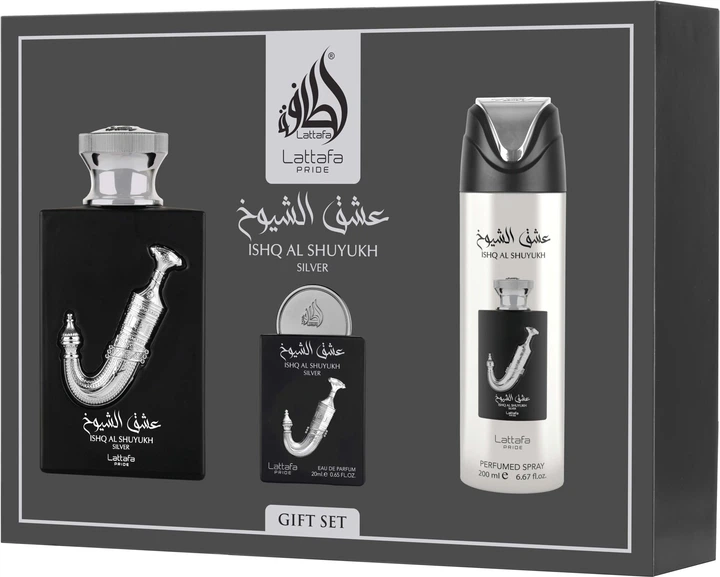 Вивільніть свою внутрішню вишуканість завдяки подарунковому набору Lattafa Ishq Al Shuyukh Silver. Створений відомим близькосхідним парфумерним брендом Lattafa, що базується в Об'єднаних Арабських Еміратах, цей аромат 2022 року є сміливою та чарівною композицією, призначеною для сучасного чоловіка та сучасної жінки. Ідеальний для щоденного використання або для особливих випадків, він вирізняється багатим амбровим ароматом та майстерним поєднанням цитрусових, спецій і деревних нот.
