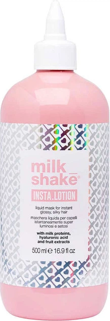 Lotion Milk_Shake Insta.Lotion, wzbogacony o proteiny mleczne, kwas hialuronowy oraz ekstrakty z cytryny i jagód, w kilka sekund rozplącze włosy, sprawi, że będą posłuszne, gładkie i błyszczące. Ma przyjemny zapach brzoskwini. Płynna konsystencja łatwo się aplikuje, wygładza porowatość włosów i zamyka łuski, nadając włosom lustrowy blask. Idealny do włosów farbowanych, chemicznie traktowanych oraz suchych.
