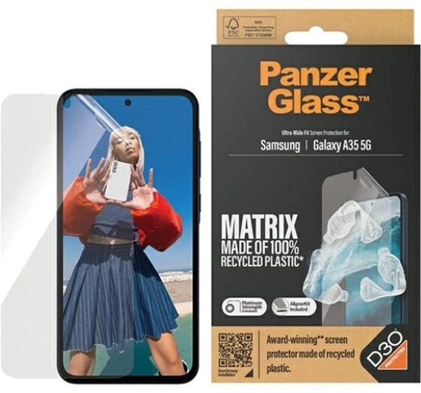 Panzer Glass Ultra-Wide Fit Matrix D3O to wielokrotnie nagradzana ochrona ekranu, zaprojektowana z myślą o trwałości, ekologii i nowoczesnym stylu życia. Wykonany w 100% z plastiku pochodzącego z recyklingu, Matrix to produkt, który łączy bezpieczeństwo urządzenia z troską o planetę. Dzięki certyfikowanemu opakowaniu FSC i zmniejszonemu zużyciu papieru o 30%, stanowi przykład zrównoważonego podejścia do technologii – bez kompromisów w zakresie jakości.