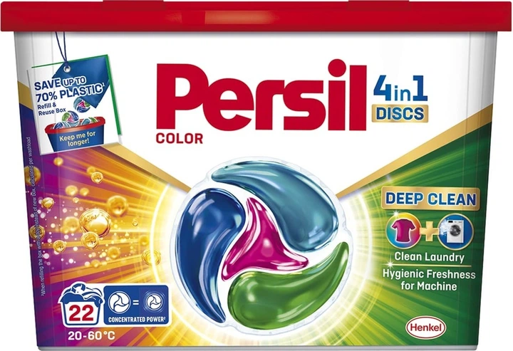 Silna formuła kapsułek Persil Discs 4w1 Deep Clean Color wnika głęboko we włókna, rozpuszczając uporczywe plamy i usuwając je. Persil Discs zapewniają czystość ubrań, jednocześnie zachowując blask i promienny wygląd kolorów, nawet po wielokrotnym praniu. Persil trafia głęboko również do elementów pralki, aby zwalczyć nieprzyjemne zapachy, pozostawiając ją czystą i higienicznie świeżą.