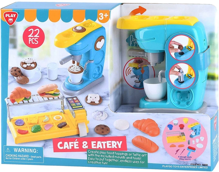 Приготуйте багети з різними начинками або каву з кавоварки, використовуючи форми та інструменти, що входять до комплекту. Зробіть булочки або різноманітне печиво та іншу випічку. Легко збирається та багаторазово використовується, ідеально підходить для творчої гри. У комплект входять чотири контейнери з глиною для ліплення (по 56 грамів кожен). Кавоварка працює від двох батарейок типу АА (в комплекті).