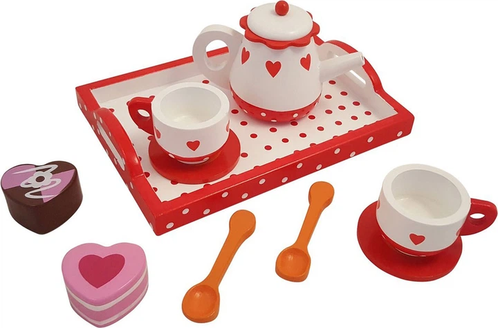 Z tym zestawem do herbaty zorganizujesz przytulne przyjęcia herbaciane. Filiżanki, imbryk i tacka ozdobione są uroczymi serduszkami i kropkami. Zestaw zawiera również dwie łyżeczki, dwa spodki i dwa ciastka. Wykonany z wytrzymałego drewna, będzie świetnym dodatkiem do kuchni do zabawy.