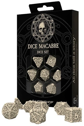 Macabre to wyjątkowy zestaw kości 3d, który natychmiast przyciąga uwagę swoją mroczną estetyką. Każda kostka ma formę bryły zbudowanej z dziesiątek drobnych czaszek, tworząc niepokojący, ale niezwykle efektowny design. to idealny wybór dla fanów horroru, dark fantasy i klimatów grozy przy stole rpg.
