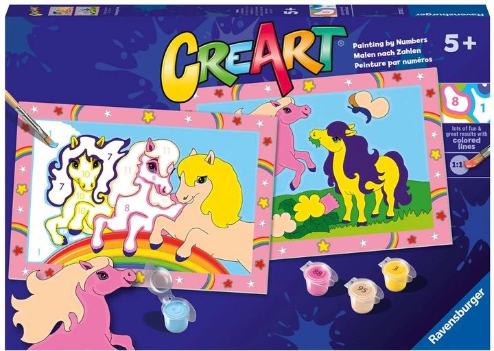 Namaluj obraz CreArt Prancing Ponies! Malowanie po numerach od Ravensburger – każdy może malować! Dzięki prostej technice malowania po numerach obudzenie w sobie artysty jest dziecinnie proste! Dzięki wyraźnym obszarom malowania z kolorowymi konturami powstaje małe i piękne dzieło sztuki o wymiarach x. Delikatniejsze niuanse kolorystyczne tworzą eleganckie przejścia kolorów i grę cieni. Rozpakuj i zacznij malować obrazek „Prancing Ponies”! Każdy może malować! Zestaw do malowania zawiera wysokiej jakości materiały: farby akrylowe na bazie wody w zamykanych pojemnikach, deskę do malowania i pędzel. Różne serie są podzielone na różne poziomy trudności: od prostych, z kilkoma dużymi obszarami do malowania dla najmłodszych, po bardzo wyrafinowane, z wieloma małymi obszarami dla doświadczonych malarzy.