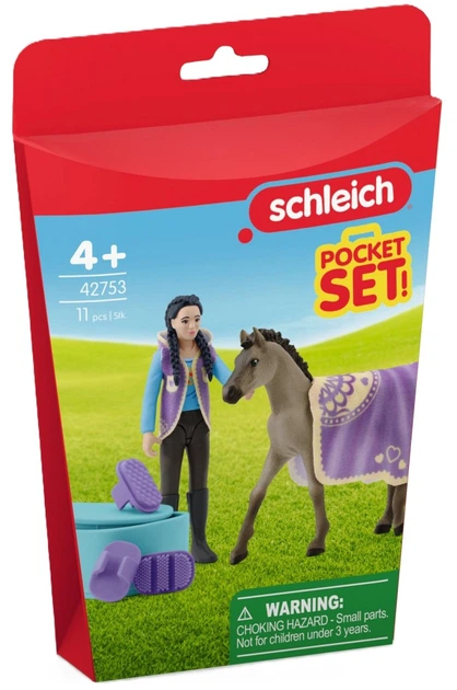 Zestaw pielęgnacyjny dla konia z Kim jest zgrabnym zestawem do samodzielnej zabawy oraz jako uzupełnienie większych pakietów Schleich (sprzedawane oddzielnie). Zaopiekuj się przesłodkim źrebakiem! Wyczesz jego sierść, a potem nałóż derkę, by czuł się kochany i wypieszczony. Właśnie tak buduje się więź ze zwierzakiem!