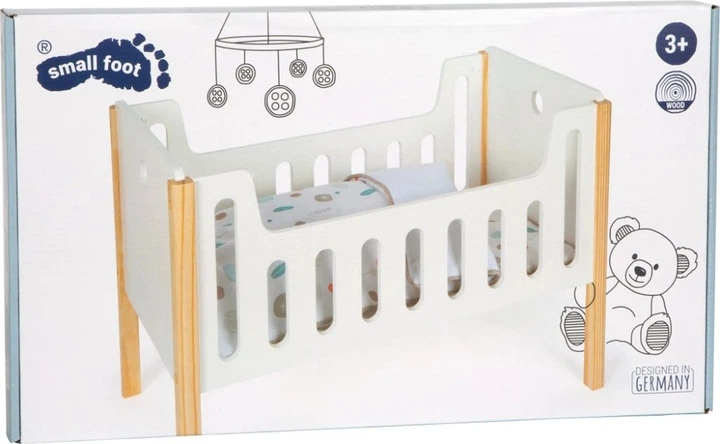 To nowoczesne drewniane łóżeczko dla lalek ma skandynawski, linearny design i jest idealnym miejscem do spania dla lalek lub pluszowych zwierzątek. Pościel z bardzo dużym kocykiem zapewnia wygodny sen większym lalkom i pluszowym zwierzętom o wysokości do 46 cm. Podwyższona powierzchnia do leżenia zapewnia również ergonomiczną zabawę dla „rodziców” lalki. To solidne łóżeczko jest naturalnym dodatkiem do każdego salonu lub pokoju dziecięcego dzięki minimalistycznemu wzornictwu w neutralnej bieli w połączeniu z naturalnym drewnem. Wysokiej jakości wykończenie z zaokrąglonymi krawędziami i widocznymi elementami z litego drewna sprawia, że to łóżeczko dla lalek jest stylowym dodatkiem do każdego zestawu do zabawy lalkami. Cechy: