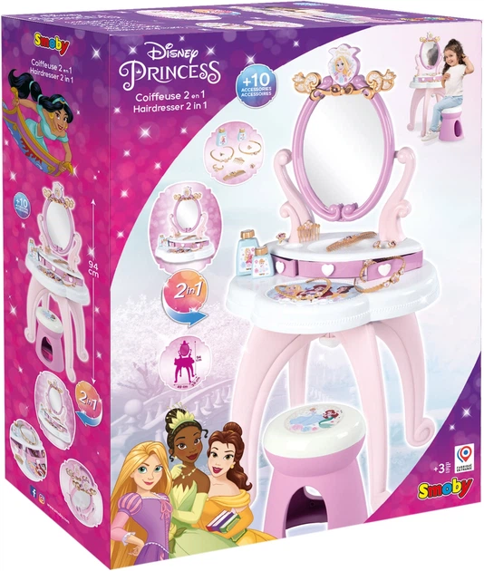 Столик із дзеркалом Дісней. Принцеси Перукарня 2 в 1 від французької компанії Smoby, створений саме для маленьких красунь. Виконаний у приємних рожевих кольорах і прикрашений зображенням відомих принцес Дісней.
