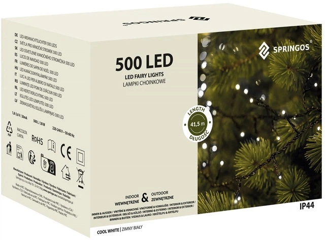 Lampki choinkowe Springos 500 LED to klasyczna i efektowna dekoracja świąteczna do różnorodnych aranżacji. Duża liczba diod LED zapewnia równomierne i intensywne oświetlenie choinki. Światło pięknie podkreśla ozdoby i naturalny kształt drzewka. Lampki doskonale sprawdzą się również na girlandach i balustradach. Technologia LED gwarantuje energooszczędność oraz długą żywotność produktu. Elastyczny przewód umożliwia łatwe dopasowanie dekoracji. Lampki tworzą przytulną, świąteczną atmosferę. Produkt pasuje do klasycznych i nowoczesnych wnętrz. Solidne wykonanie zapewnia niezawodność przez cały sezon. Lampki są łatwe w montażu i przechowywaniu. Dekoracja może być używana w domach i przestrzeniach publicznych. To uniwersalna ozdoba na zimowy okres.