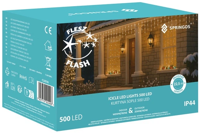 Lampki Springos Kurtyna Sople 500 LED to efektowna dekoracja świetlna inspirowana zimowym krajobrazem. Zwisające sople tworzą elegancki i naturalny efekt lodowych form. Duża liczba diod LED zapewnia jasne, równomierne oświetlenie całej kurtyny. Dekoracja doskonale sprawdzi się na elewacjach, balkonach i okapach dachowych. Technologia LED gwarantuje energooszczędność oraz długą żywotność. Lampki zostały zaprojektowane z myślą o użytkowaniu na zewnątrz. Światło pięknie prezentuje się po zmroku, podkreślając architekturę budynku. Kurtyna jest łatwa w montażu i stabilna w użytkowaniu. Równomierne rozmieszczenie sopli tworzy spójną kompozycję. Produkt doskonale komponuje się z innymi dekoracjami świątecznymi. To elegancki sposób na zimową iluminację domu. Dekoracja przyciąga uwagę i buduje świąteczny klimat.