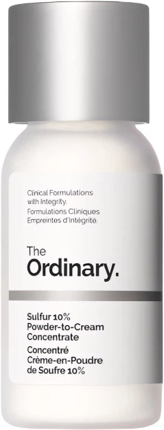 Koncentrat Cream-to-Powder z 10% siarką to formuła o ukierunkowanym działaniu, która aktywnie pomaga redukować wypryski już od pierwszej aplikacji, zapewniając widoczne rezultaty w niecałą godzinę. Zawiera 10% siarki, aby poprawić wygląd miejscowych niedoskonałości. Siarka działa delikatnie, ograniczając widoczność wyprysków, dzięki czemu idealnie nadaje się do skóry wrażliwej. W formule występuje w formie koloidalnej, z mniejszymi cząsteczkami, które wspomagają skuteczną dyfuzję – jest bezwonny i niewyczuwalny na skórze. Jego unikalna, transformująca konsystencja i format pudru do stosowania w podróży pozwalają na indywidualne dozowanie i łatwą aplikację w dowolnym miejscu. Po zetknięciu z opuszkami palców puder przekształca się w krem zwalczający niedoskonałości, który idealnie wtapia się w skórę.
