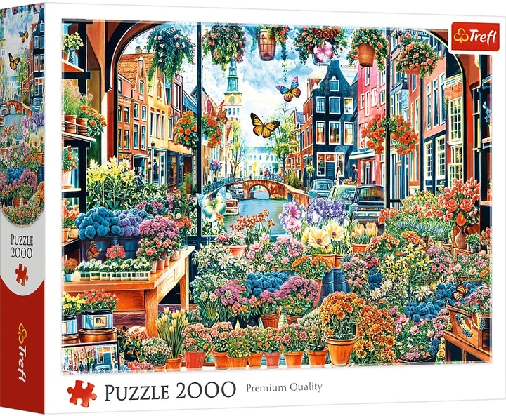 Puzzle Kwiaciarnia w Amserdamie składające się z 2000 elementów przedstawiają barwną, pełną kwiatów scenerię urokliwego amsterdamskiego kanału, otoczonego zabytkowymi kamienicami, mostkiem oraz bogato ukwieconymi straganami i balkonami, nad którymi unoszą się motyle. Po ułożeniu powstanie obraz o wymiarach 961 x 682 mm. Produkt został wykonany w Polsce z wysokiej jakości materiałów. Zastosowanie specjalnego kalandrowanego papieru odbijającego światło sprawia, że układanie jest łatwiejsze.