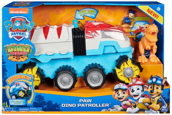 В машині Діно-патролер є місце для шести цуценят, великі колеса, гранатомет та ексклюзивні фігурки Гонщика та динозавра — Тиранозавра. Коли динозаври потребують допомоги, помістіть Гонщика і ще одного цуценя-рятувальника (продається окремо) у кабіну, а Рятувальний автомобіль Діно-місія деклюкс (продається окремо) у задній відсік. Завантажуйте снаряди в пусковий пристрій та готуйтеся до епічних рятувальних місій. Натисніть кнопку зі значком Щенячого патруля, щоб запустити рятувальний автомобіль.