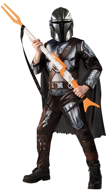The Rubies Star Wars Костюм мандалорця складається з комбінезона, маски та накидки. М'який костюм уособлює обладунки відомого мисливця за головами. Має довгий рукав і доповнений чорною накидкою. Маска імітує шолом мандалорця і має сіточку посередині. Він оснащений еластичною стрічкою для зручного утримання. Вашій дитині сподобається інтерпретувати мандалорця в цьому костюмі на карнавалі або тематичній вечірці "Зоряних воєн". Включає: - комбінезон, накидку та напівмаску. Склад матеріалу: - 100% поліестер.