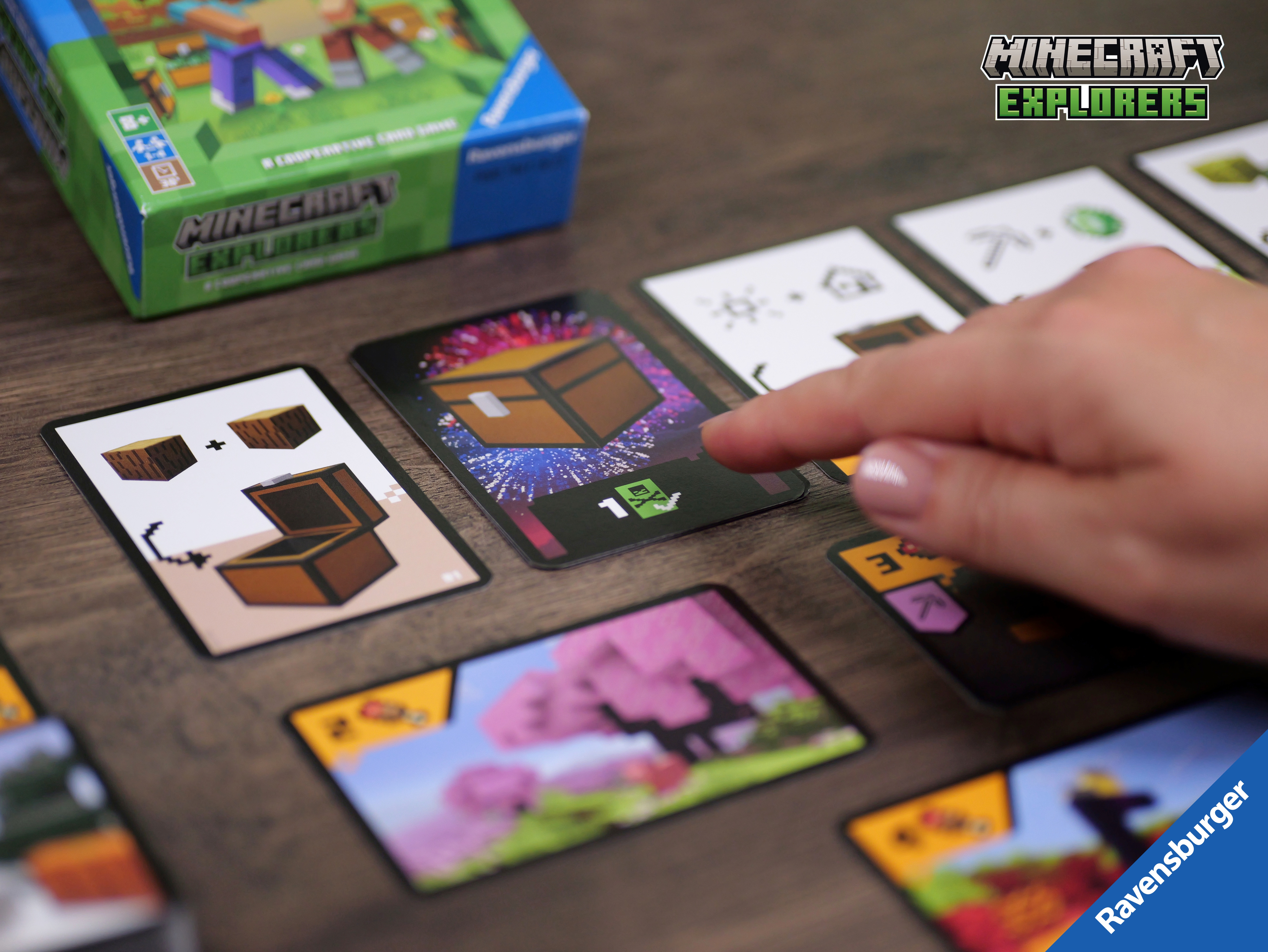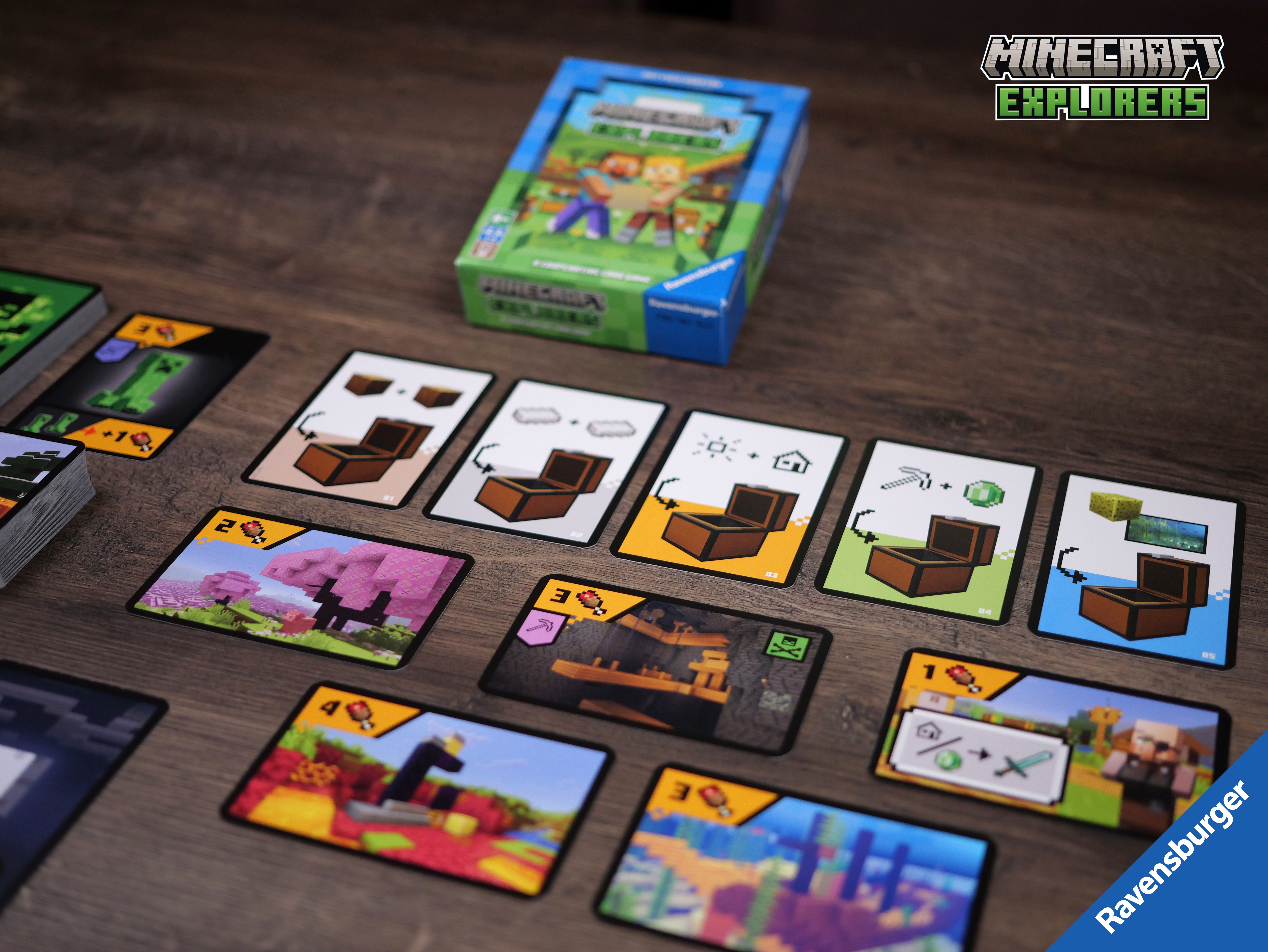 W grze Minecraft Explorers wspólnie będziecie przemierzać świat z gry w poszukiwaniu przedmiotów widniejących na kartach skrzyń. Zwyciężacie natychmiastowo, jeśli uda Wam się zapełnić wymaganymi przedmiotami wszystkie skrzynie poza jedną. Sami decydujecie, które ze skrzyń chcecie zapełniać, a podczas rozgrywki możecie zmienić zdanie. Musicie się jednak pośpieszyć! Odkrycie karty „GAME OVER” oznacza natychmiastową porażkę. Im szybciej ubywa kart na stosie mobów, tym bliżej przegranej jesteście.