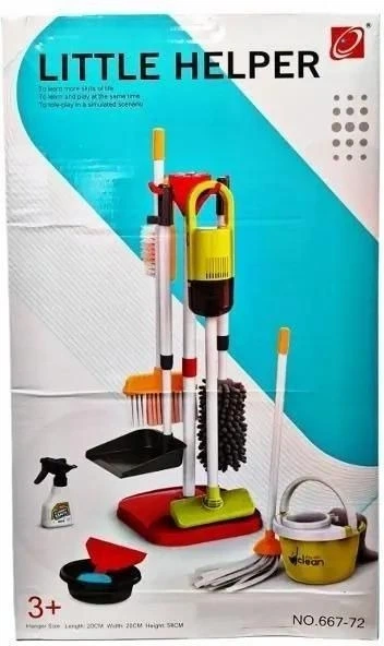 Zestaw do sprzątania z odkurzaczem, mopem, wiaderkiem, szczotką i innymi akcesoriami. Wybrane elementy zestawu działają na baterie typu AA. Baterie nie są załączone do zabawki. Zabawka przeznaczona dla dzieci od lat 3. Produkt zapakowany w kartonowe pudełko