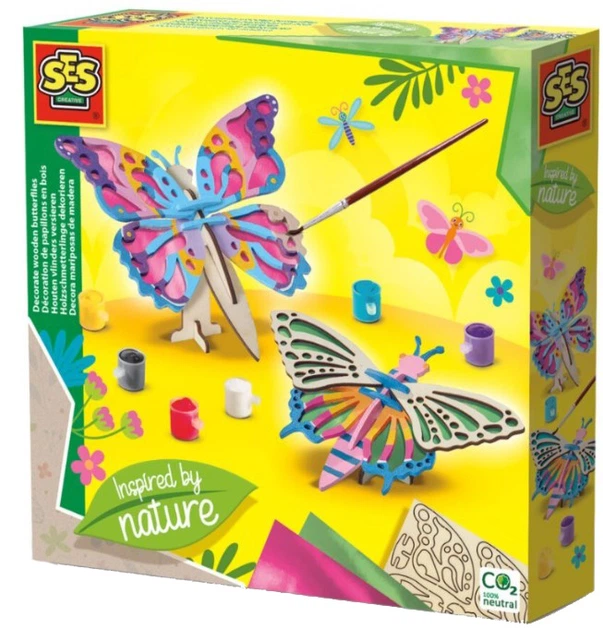 Інноваційний набір для творчості від нідерландської компанії SES Creative дає можливість самостійно прикрасити яскравих дерев’яних метеликів. У комплект входять дерев’яні пластини, з яких потрібно акуратно виламати елементи, щоб утворити форму метелика. Деталі можна розфарбувати фарбами з набору або прикрасити самоклейним папером у зеленому та рожевому кольорі. Після цього достатньо зібрати елементи за інструкцією — і метелик готовий!