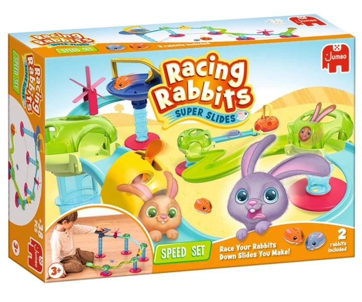 Відкрийте для себе захопливий світ Racing Rabbits – модульних треків, які дозволяють створювати унікальні дизайни з простих у використанні деталей. Зберіть гірку з набору Speed та дозвольте кроликам мчати по ній! Помістіть одного з 2 милих кроликів на верхівку лійки та уважно спостерігайте, як він скочується вниз! Грайте з трюками, які трапляються кролику на шляху, адже тільки тоді він досягне кінця треку.