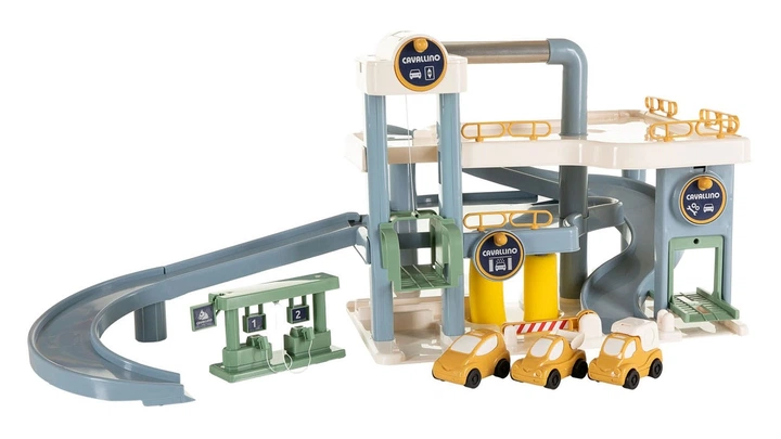 Luksusowy garaż Cavallino w pastelowych kolorach z 3 samochodzikami. Garaż zawiera 2 poziomy parkingowe i różne atrakcje, takie jak myjnia samochodowa, winda, mostek samochodowy i stacja benzynowa. Wymiary: 48.5 x 39 x 39 cm. Odpowiedni dla dzieci od 3 lat.