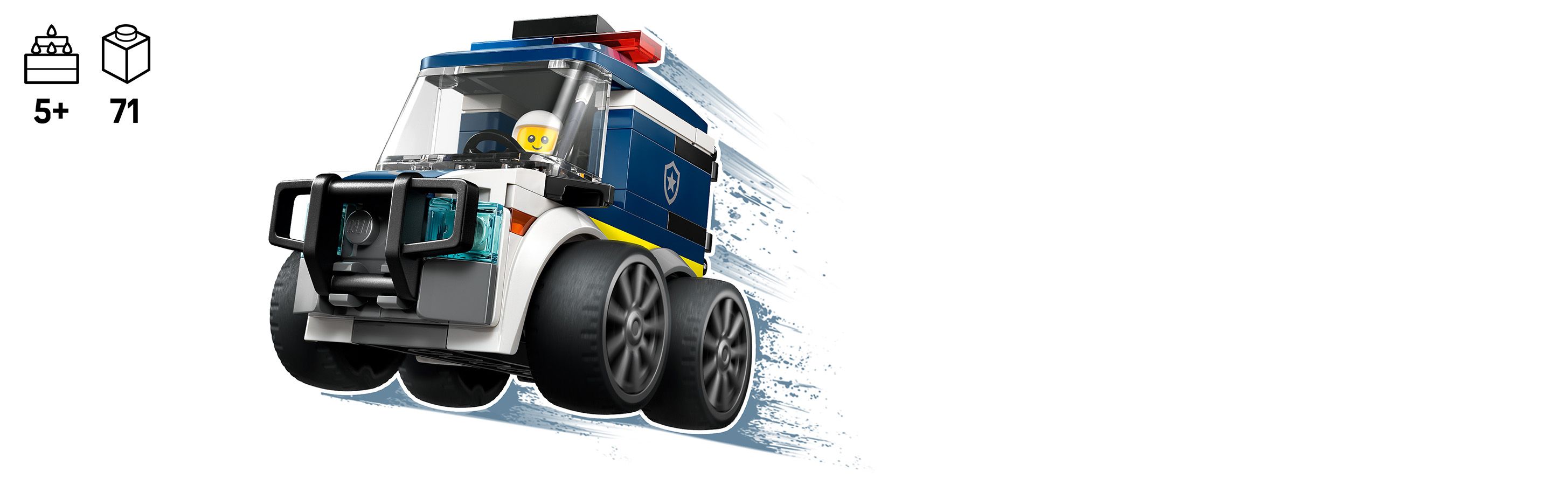 З набором LEGO City Автівки — Поліцейська вантажівка діти можуть насолоджуватися інтуїтивним будуванням за допомогою додатка LEGO Builder, збільшуючи та обертаючи 3D-інструкції, а також зберігаючи та відстежуючи прогрес у додатку. Набір містить 71 деталь.