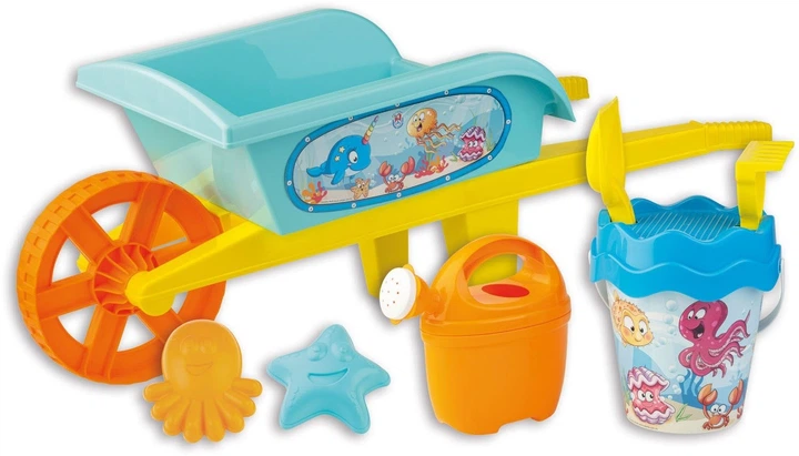 З цим веселим пляжним набором тачки від Androni Giocattoli діти зможуть насолоджуватися безкінечними розвагами на пляжі! Підводний світ оживає завдяки барвистому відру, ситу, граблям, лопатці, лійці та двом піщаним формочкам у формі морської зірки та восьминога. Міцна тачка ідеально підходить для легкого транспортування всього пляжного спорядження та забезпечує захопливі морські пригоди.