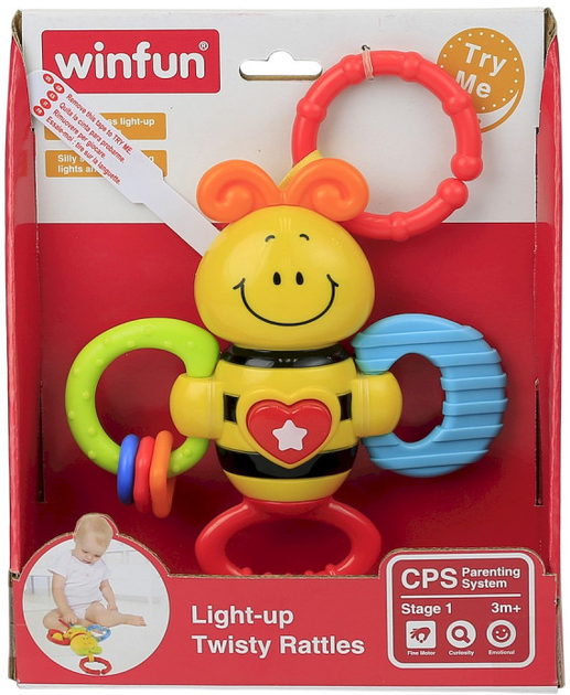 Натиснувши центральну кнопку, дитина активує звуки та миготливе світло. Також брязкальце має спеціальний тримач, що дозволяє підвісити його біля ліжечка, у колясці чи в будь-якому зручному місці.