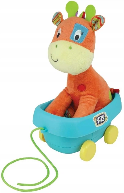 Жирафка Little Pals — це м’яка плюшева іграшка з коляскою, створена спеціально для найменших. Посадивши тваринку в коляску, дитина може тягнути її за мотузку під час прогулянки або штовхати поперед себе, слідуючи за рухом. Така активність стимулює рухливість і заохочує малюка більше повзати та робити перші кроки.