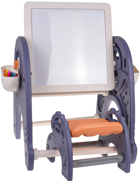Великий багатофункціональний набір, що складається з двох таблиць: крейдяної та магнітної, а також стільчика, призначений для дітей від 3 років. Каркас можна встановити у двох варіантах. У першому варіанті з одного боку буде магнітна таблиця, а з іншого – крейдяна. Висоту таблиць також можна регулювати. У другому варіанті буде столик, на стільниці та прилеглій стінці якого будуть дві таблиці. На білій стороні можна писати фломастерами або прикріплювати кольорові магніти. На чорній стороні можна малювати крейдою, а також прикріплювати кольорові магніти.