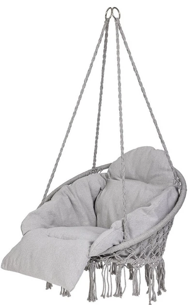 Створена з урахуванням вашого комфорту, вона забезпечує ідеальне положення для тіла, а м’яка подушка додає ще більше приємних відчуттів під час гойдання. Її світла кольорова гама не тільки підкреслить красу вашого саду, але й стане елегантним доповненням інтер’єру дому. Виготовлена з міцних матеріалів та оснащена надійними мотузками, ця гойдалка без труднощів витримає до 150 кг.