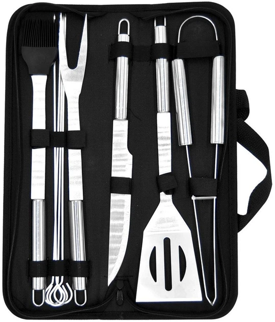Набір Orion складається з дев'яти практичних приладів і чохла, необхідних для приготування барбекю. До його складу входять: лопатка для перевертання, виделка, щипці, ніж, пензлик, шампури для шашликів і функціональний чохол. Всі елементи виготовлені з високоякісної нержавіючої сталі елегантного сріблястого кольору, що забезпечує довговічність, стійкість до пошкоджень і можливість миття в посудомийній машині. Прилади мають зручні, стійкі ручки, які завдяки своїй довжині гарантують комфорт використання і безпеку при роботі з грилем. Додаткові отвори в ручках дозволяють легко повісити аксесуари на кухонну рейку або гриль, що полегшує їх зберігання. Набір відмінно підійде як для дому, так і для використання на відкритому повітрі, дозволяючи накладати, перевертати і подавати страви. Лопатка оснащена гострим краєм, завдяки якому можна також різати страви прямо під час приготування на грилі. Все упаковано в практичний чохол на блискавці з ручкою, який полегшує транспортування і зберігання набору.