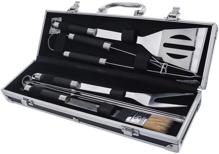 Набір для гриля Orion — це повний комплект аксесуарів для гриля та запікання, який включає в себе всі найнеобхідніші пристосування, упаковані в практичний чемодан з ручкою та замками. Інструменти виготовлені з високоякісної нержавіючої сталі сріблястого кольору, що забезпечує їх довговічність, стійкість до іржі та легкість очищення, в тому числі в посудомийній машині. У комплект входять: лопатка для перевертання, виделка, щипці, пензлик і чотири шампури для шашликів, всі відповідної довжини і з ергономічною ручкою, яка полегшує стійке утримання і безпечну роботу при приготуванні на грилі. Інструменти універсальні — ідеально підходять для перевертання, накладання і подачі страв як при приготуванні барбекю на відкритому повітрі, так і вдома. Завдяки міцній конструкції і зручному чохлу набір також підійде в якості практичного подарунка для любителів барбекю, а його компактна форма полегшує зберігання і транспортування всіх елементів.