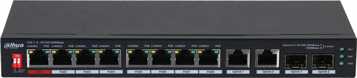 Два комбіновані uplink-порти (RJ-45 або SFP) забезпечують гнучке підключення до магістральної мережі або маршрутизатора. Підтримка стандартів IEEE 802.3af/at/bt і Hi-PoE дозволяє живити пристрої потужністю до 90 Вт на одному порту та до 96 Вт сумарно.