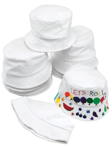 Цей набір містить 10 порожніх капелюхів з полотна, які діти можуть прикрасити самостійно фарбами, маркерами, блискітками, глітером та іншими матеріалами для рукоділля. Це чудове творче заняття для літа, відпусток, вечірок або групових заходів — їх потім можна носити в парку, на пляжі або на прогулянці.