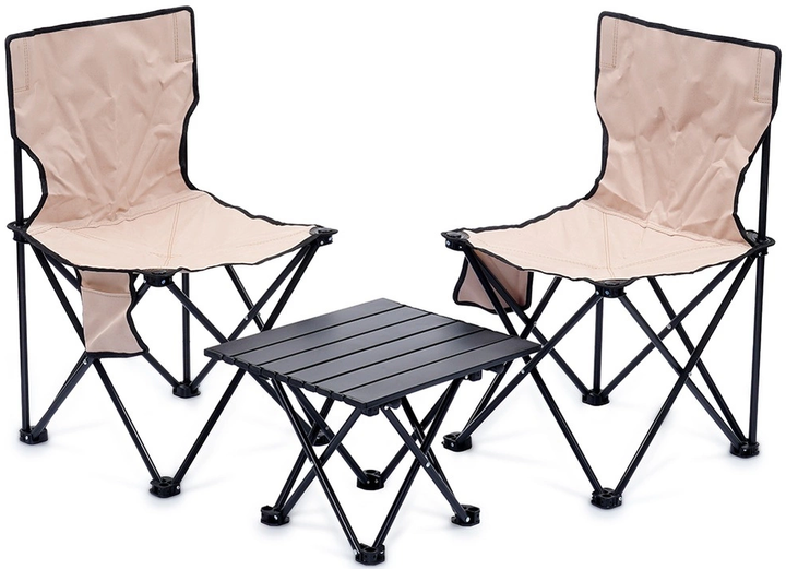 - Два розкладні стільці зі столом - Дорожній комплект, що складається з двох розкладних стільців та практичного столу. Комплект постачається в сумці для перенесення. Розкладний кемпінговий стілець має розміри 42 x 42 x 72 см. Розміри столу в розкладеному вигляді - 40 x 35 x 29 см.