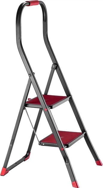 • Різні типи – розкладна сталева драбина доступна у версіях з 2 та 3 сходинками. Її виразний чорно-червоний колір виділятиметься на тлі іншого обладнання. У складеному вигляді вона не займає багато місця, тому ви завжди можете мати її під рукою.