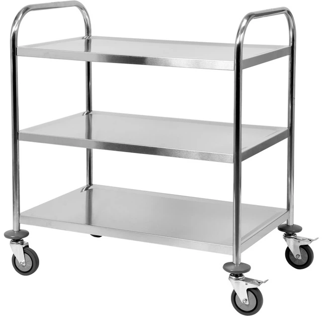 Три великі полиці розміром 820 × 500 мм завершені спеціальним бортиком, який запобігає зісковзуванню продуктів під час перевезення. Усі краї візка заокруглені, що додатково підвищує безпеку під час використання.