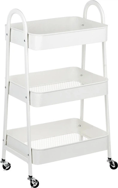 Практична трирівнева полиця на колесах. Полиця міцно виготовлена і водночас легка. Вона дуже зручна, оскільки має колеса, завдяки яким можна змінювати її положення. Надзвичайно корисна в будинку, але також у майстерні чи офісі. Підходить для зберігання різних предметів.